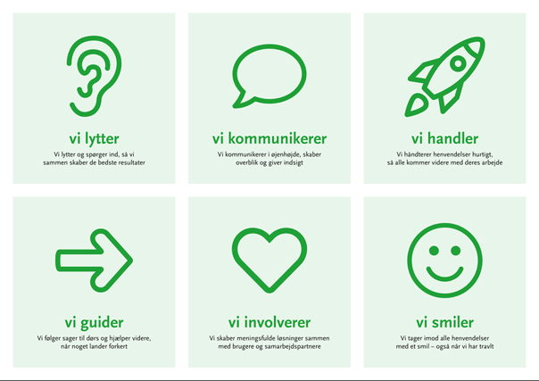 I Fælles Service har vi seks serviceløfter, som konkretiserer hvordan vi vil realisere vores vision og som er retningsgivende for, hvordan vi leverer god service: